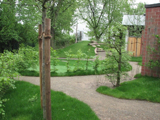 Eine Hecke um das Spielfeld herum gibt Schutz für alle vor störenden Bällen.